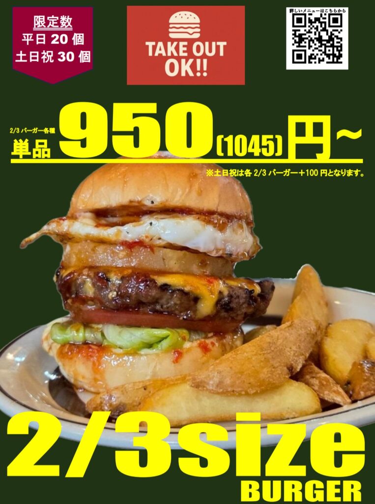 想像以上に反響のあった2/3SIZEバーガー、土日もオーダーいただけるようになりました!