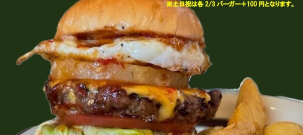 Our 2/3 size burger has been much more popular than we expected, and now you can order it on weekends too! *There is an additional 100 yen charge on weekends and holidays. We have also placed a limit on the number of burgers you can order. 20 burgers on weekdays and 30 burgers on weekends and holidays. Children under elementary school age can order regardless of the quantity limit. Enjoy a delicious, hearty burger that is a little quick and affordable! We look forward to seeing you today, from lunch to dinner!!
