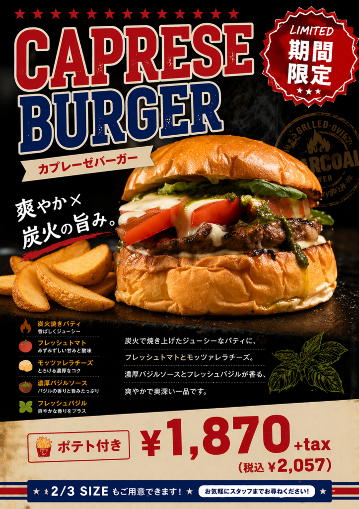 期間限定のカプレーゼバーガー、お客さんからもスタッフからも好評いただいています🍔
